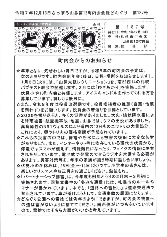 こんにちは、山鼻第12町内会です。 令和7年12月の回覧板(第187号)を掲載します。 雪の積もる時期になってきました。くれぐれも体調にはご留意ください。 引き続き山鼻第12町内会をよろしくお願いします。