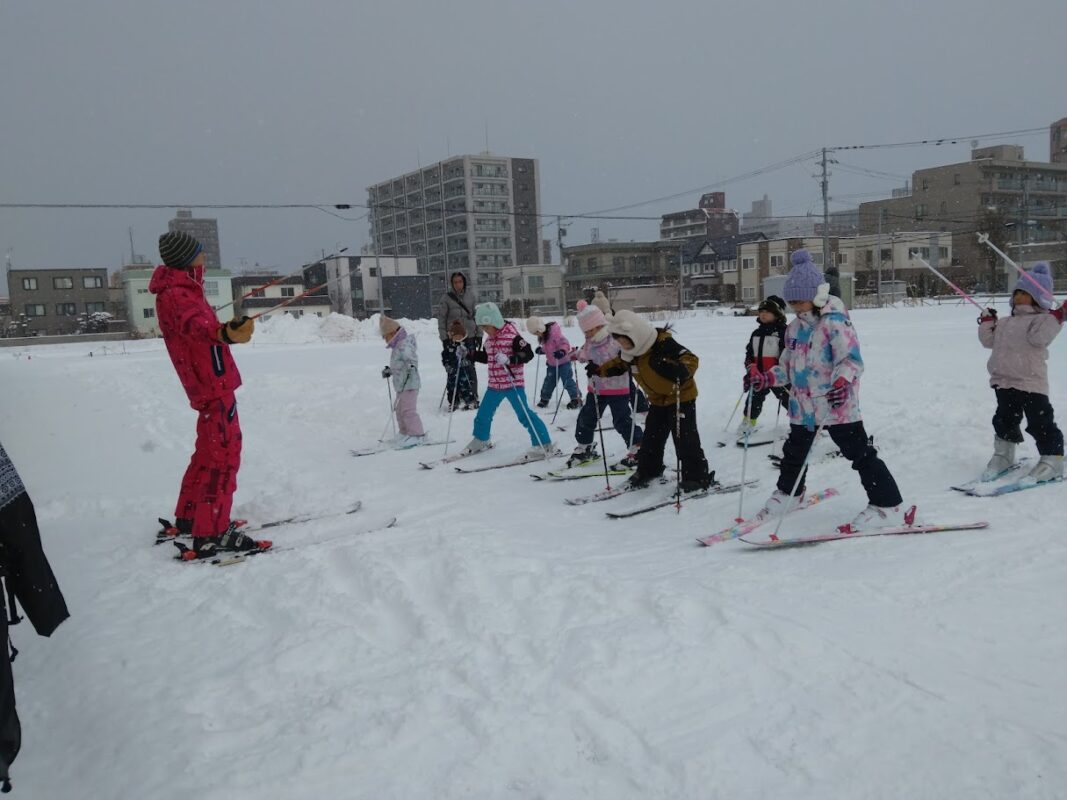 1月4日(日)には、初めてスキーをする参加者を対象に、山鼻会館横のグラウンドで、平地や小さな雪山での初歩動作レッスンも行われました。準備運動の後、ストックの持ち方からスキーの扱い方など基本的な動作を学びました。