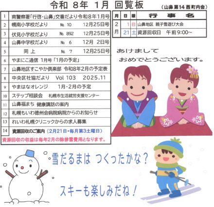 1月の回覧板が回っています。 皆さん、お読みください。 雪が降れば除雪がつきものです。 資源回収の収益が、町内会の除雪の費用になります。 皆さんご協力をお願いします。 お知らせは2月の資源回収です。お間違えないように。