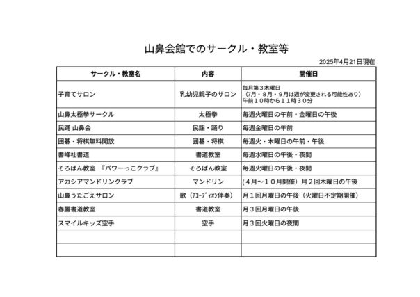 山鼻会館のページに活動サークル・教室の一覧を掲載しました